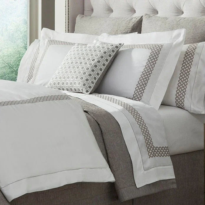 Les housses de couette Avalon sont conçues avec un corps en satin blanc uni, avec une broderie géométrique en forme de « U » encadrant le matelas et une finition à ourlet guidé à la main le long de l'ourlet de la bride.