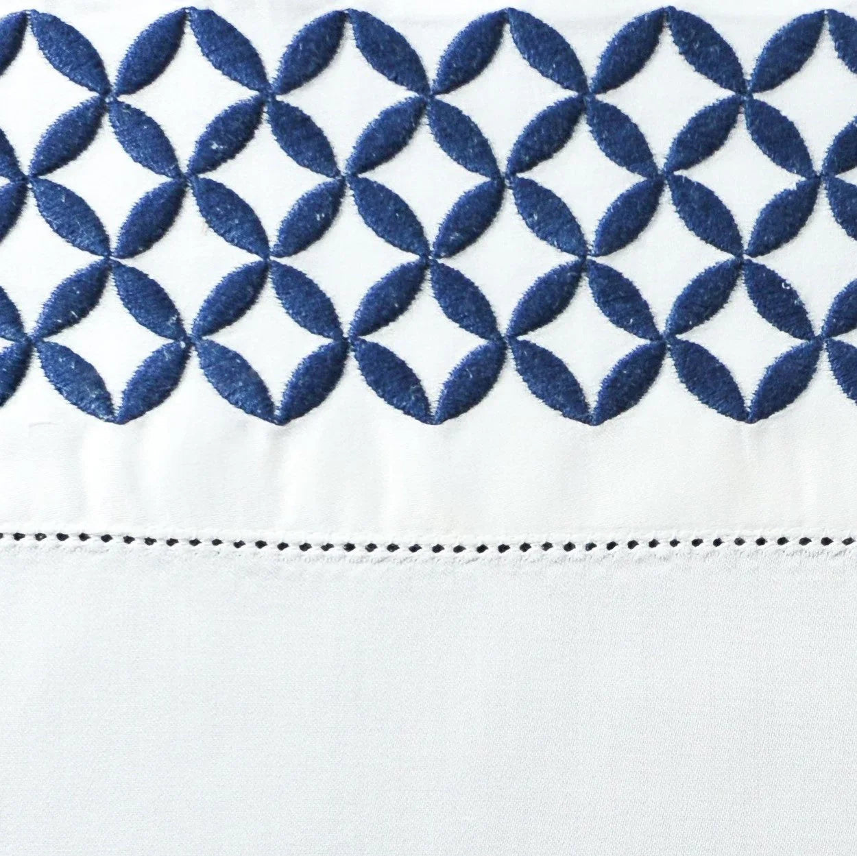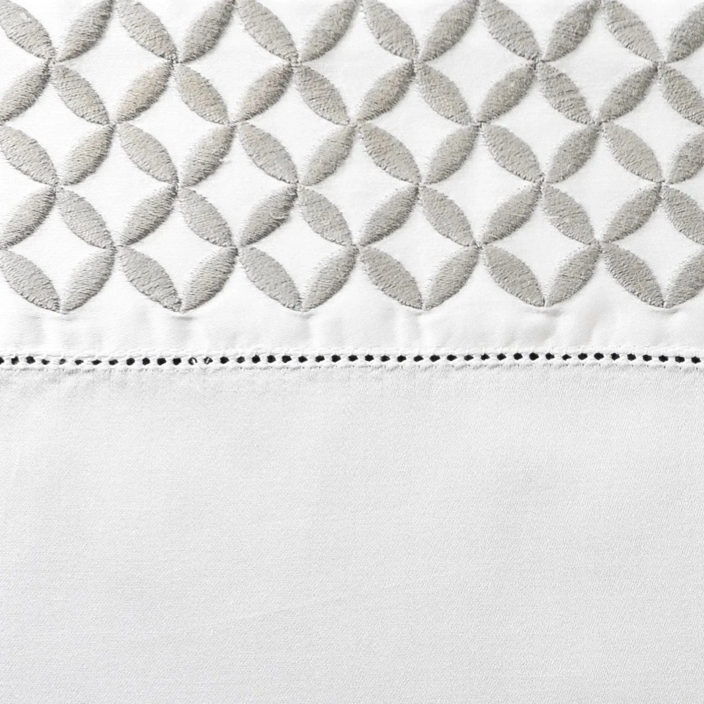 Les taies d'oreiller Avalon sont conçues avec un corps en satin blanc uni, une broderie géométrique le long de l'ourlet de la bride et une finition à ourlet guidé à la main.