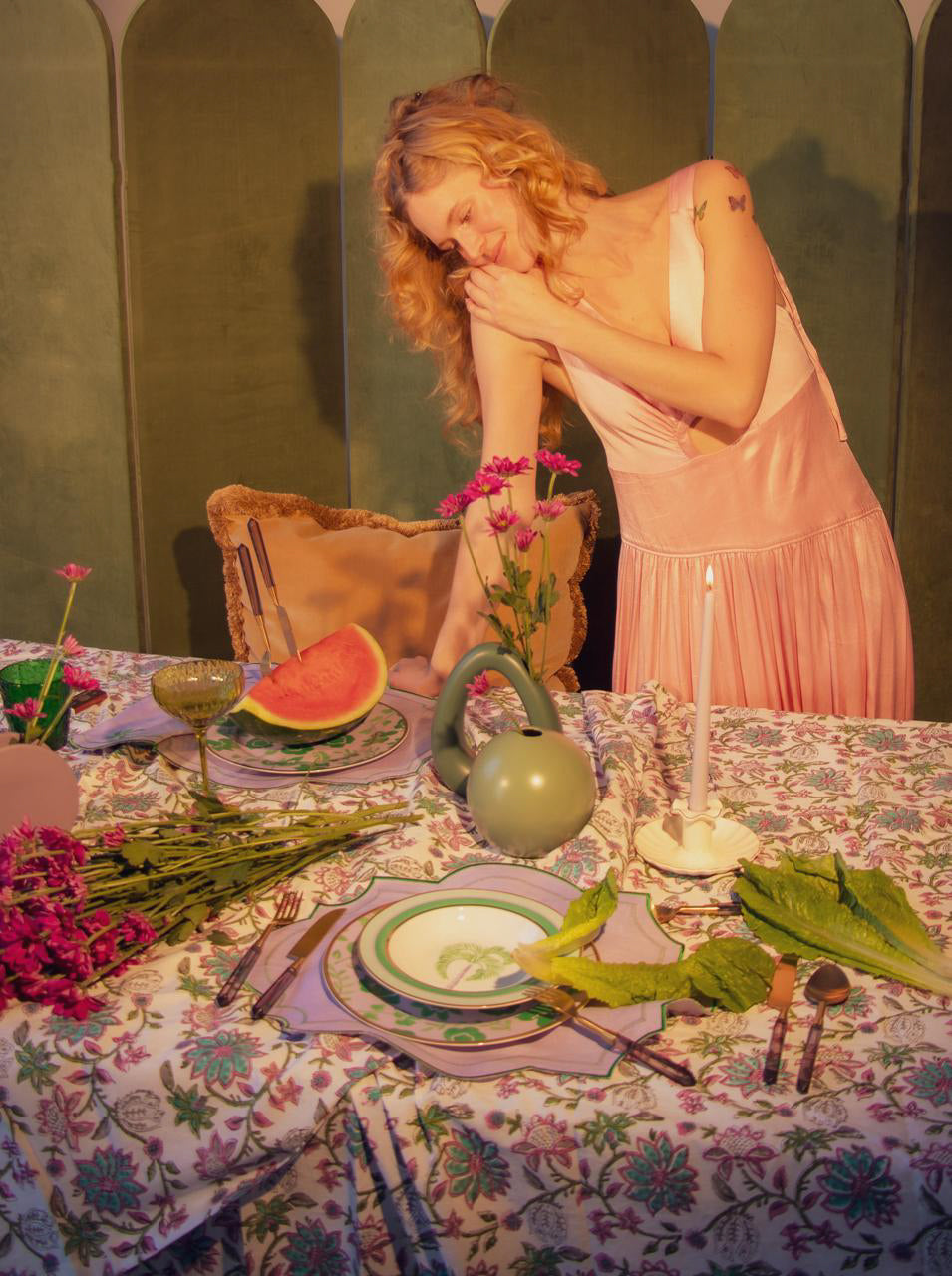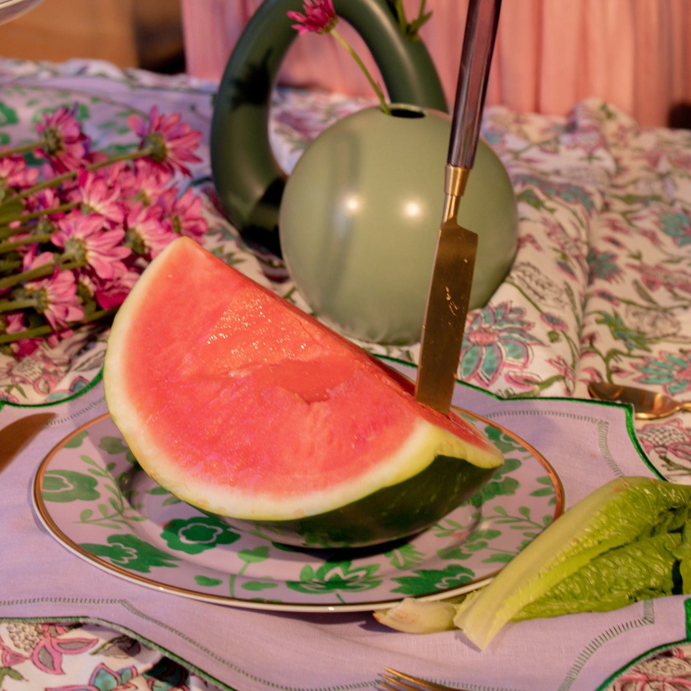 Ornée d'un fond lavande pastel et de motifs de fleurs et de feuilles vertes dessinés à la main, cette assiette à dîner s'accorde parfaitement avec notre bol à soupe Bernadette Palm. Elle est cerclée d'un bord doré.