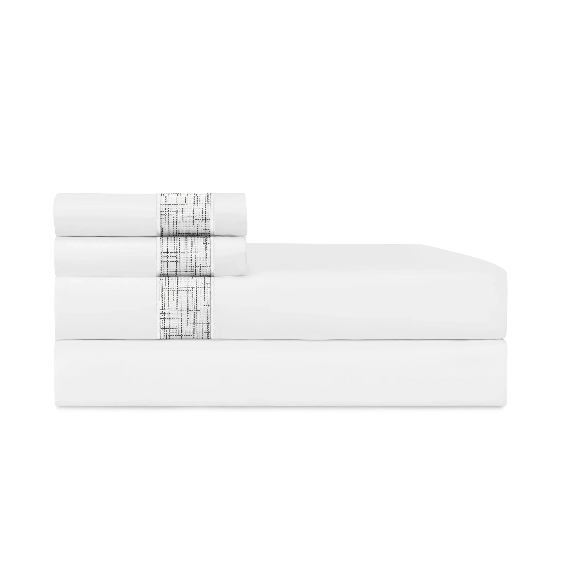 Les draps plats Daphne sont conçus avec notre satin royal de 300 fils, en blanc naturel, avec un insert en tissage Daphne de 1,5', bordé de points de satin.