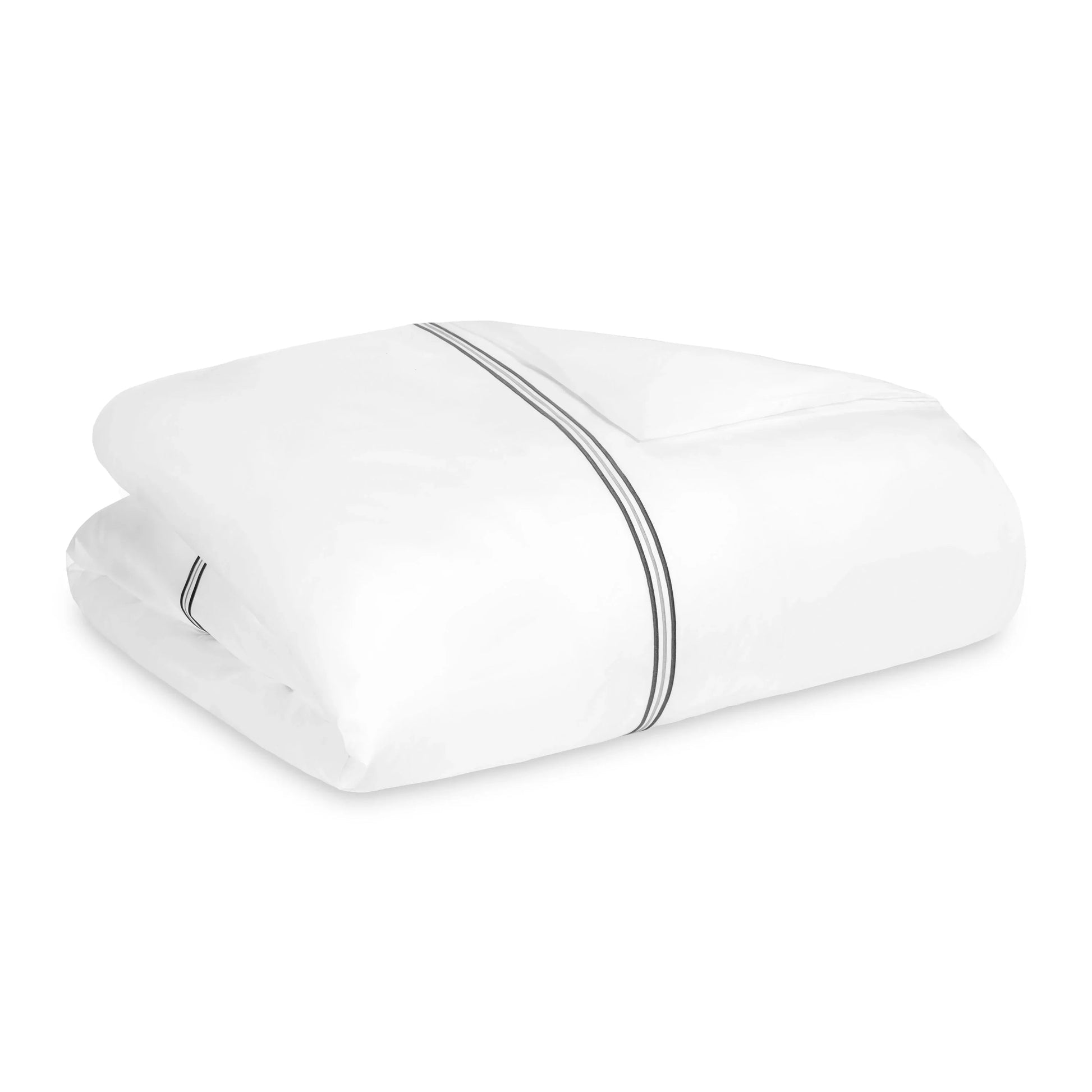 Les housses de couette Delancey sont conçues avec un corps en percale blanche unie et une triple broderie satinée bicolore en forme de U encadrant le matelas. (Remarque : les housses de couette sont dotées d'une finition bord-couteau, de quatre attaches d'angle et d'une fermeture à boutons.)