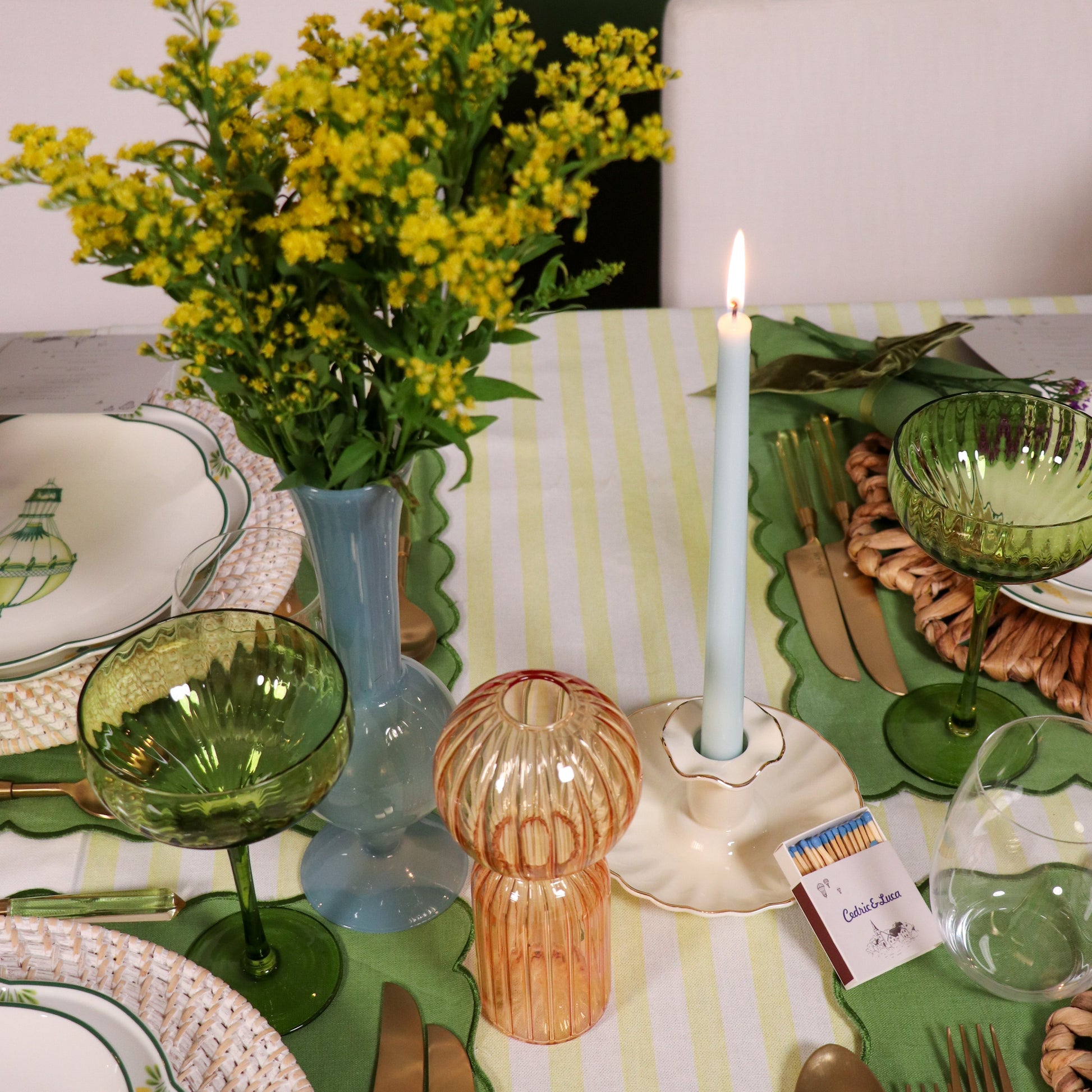 Bougeoir en céramique crème avec un design cannelé et des bords dorés.