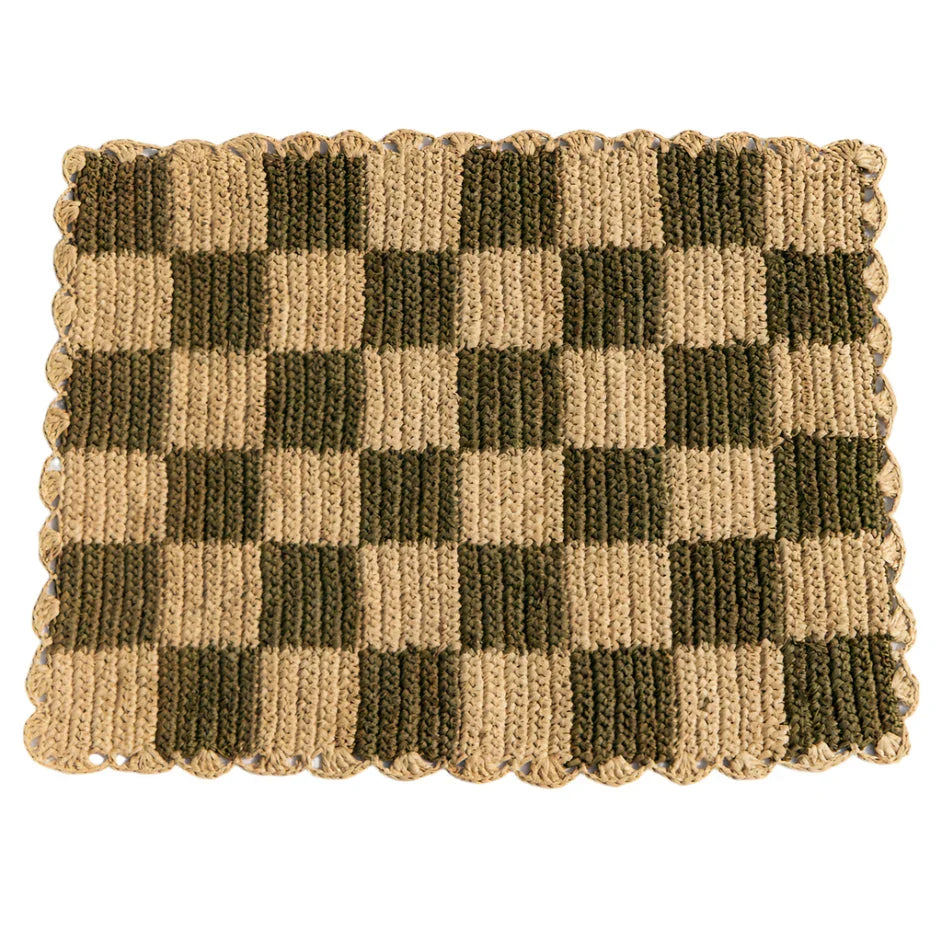 Set de table à carreaux verts, plateau rectangulaire en raphia