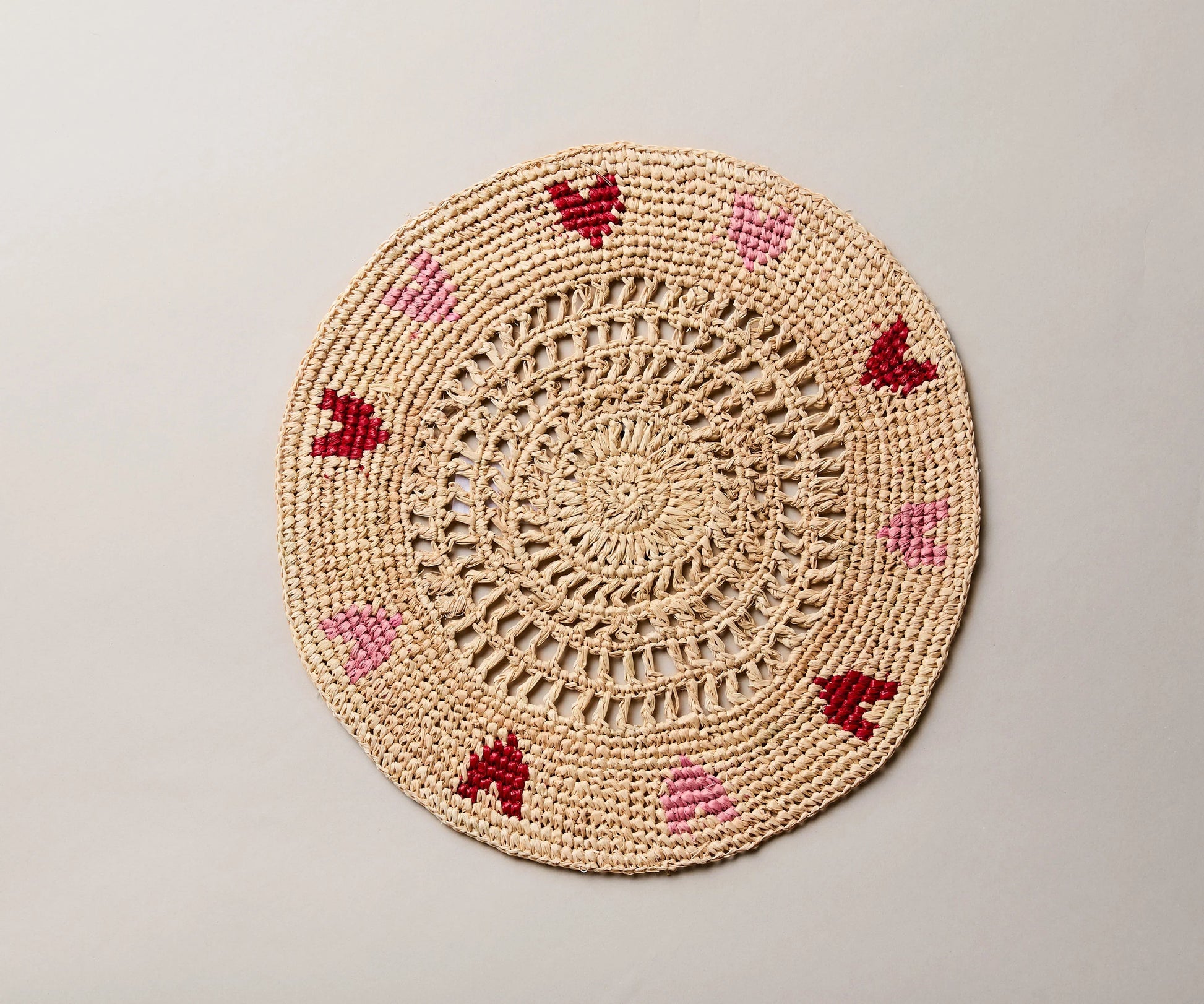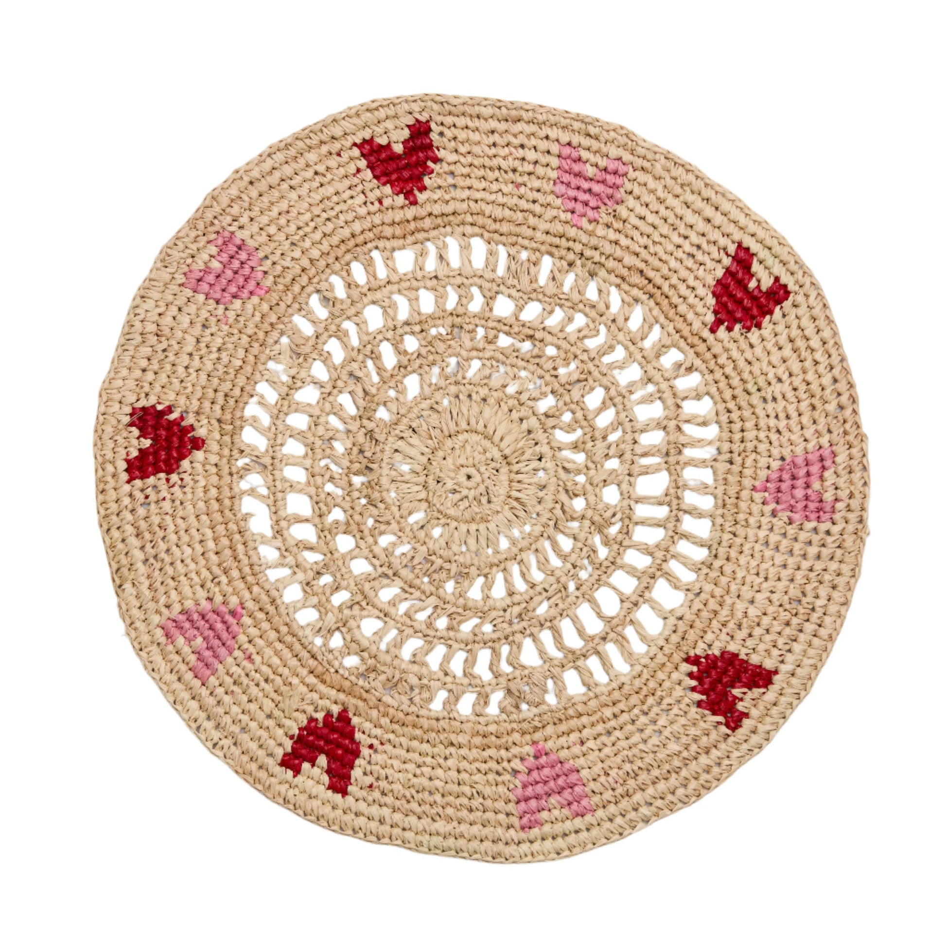 Set de table en raphia tissé à la main avec cœurs rouges et roses – Décoration de table artisanale