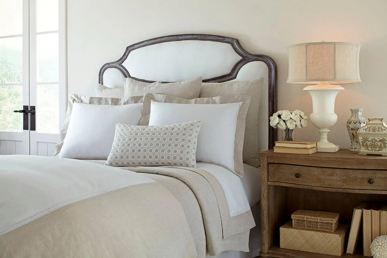 Les taies d'oreiller Linea sont conçues avec un corps en percale blanche unie, avec une bride en lin de 2,5' et un insert en dentelle dorique.