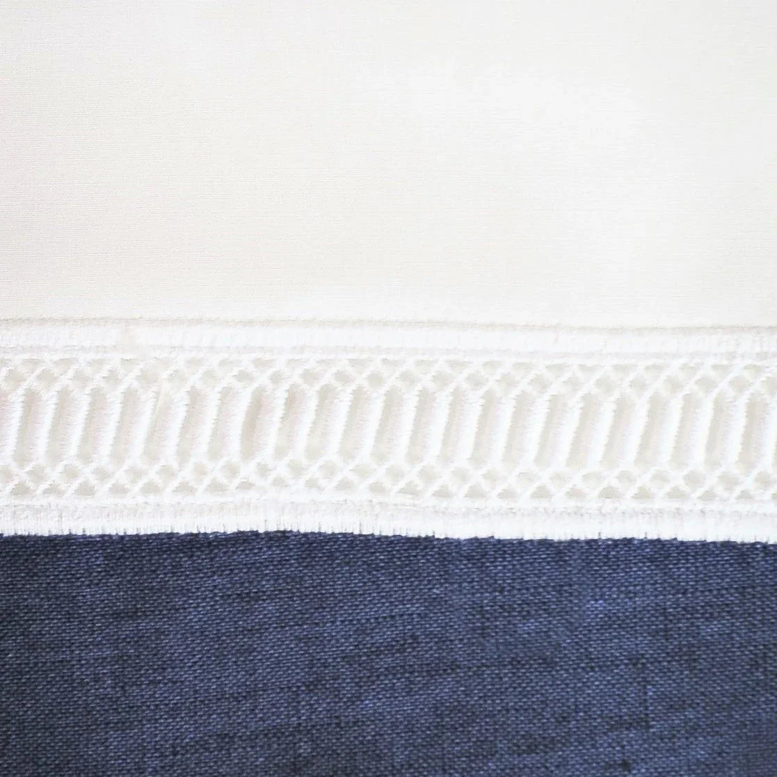 Élégants et sophistiqués, nos rideaux de douche Linea associent deux couleurs de lin italien à un insert classique en dentelle dorique blanche.