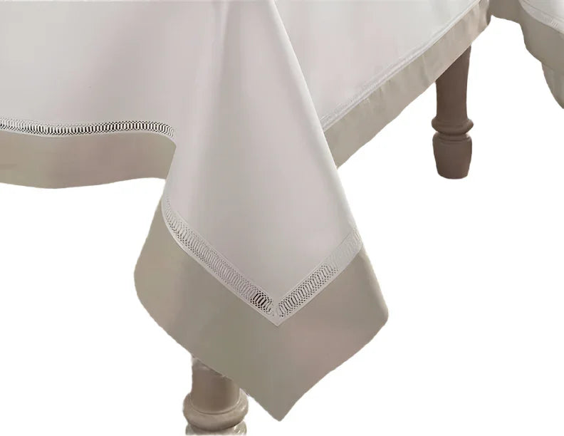 Les nappes en lin Linea sont conçues avec une bordure en lin contrastée et notre empiècement en dentelle dorique classique à l'ourlet.