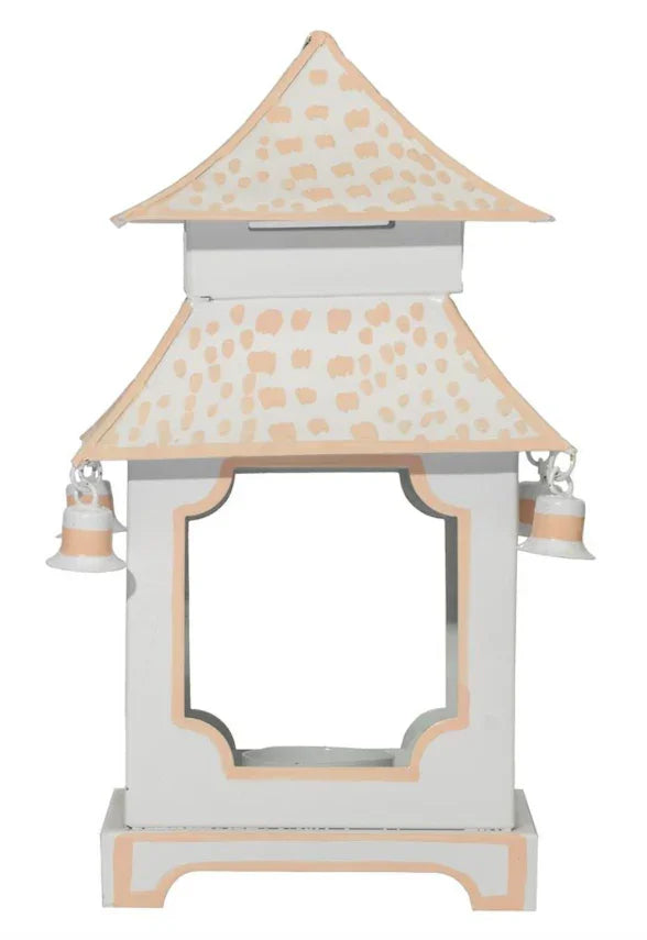 Cette magnifique pagode en métal est une pièce décorative époustouflante, conçue pour sublimer n'importe quel espace. Ornée de détails complexes peints à la main et de quatre charmantes cloches, elle émet un doux tintement lorsqu'on la déplace. Idéale pour y placer une bougie, la lumière danse à travers ses quatre fenêtres vitrées, créant une lueur chaleureuse et accueillante.
