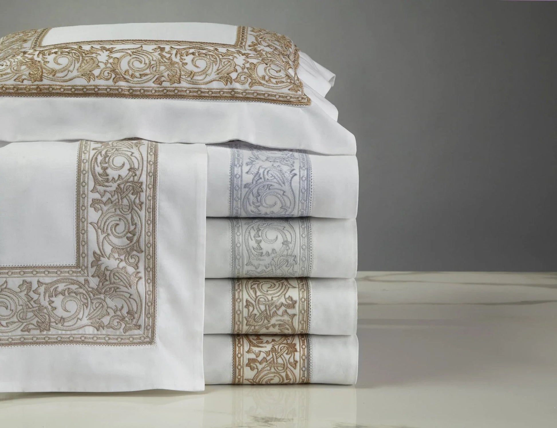 Les draps plats Paris présentent un corps en satin uni, avec une broderie appliquée et une finition à ourlet ton sur ton guidée à la main.