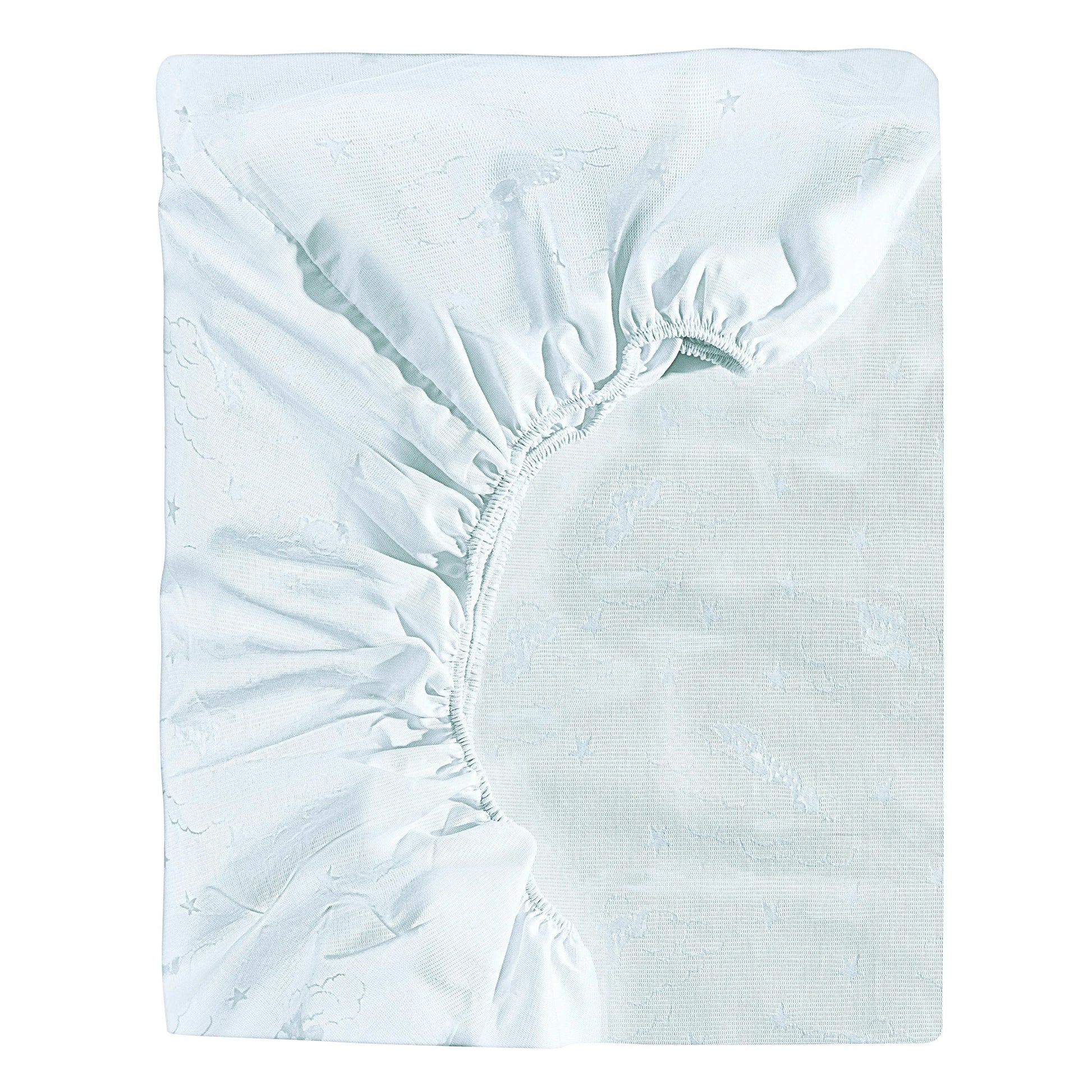 Les draps-housses pour berceau Sweet Dreams sont confectionnés en jacquard italien 100 % coton égyptien 300 fils au pouce carré, avec un motif nuage, et sont dotés d'une poche de 2,4 m. (Remarque : les draps-housses sont vendus par lot de 2.)