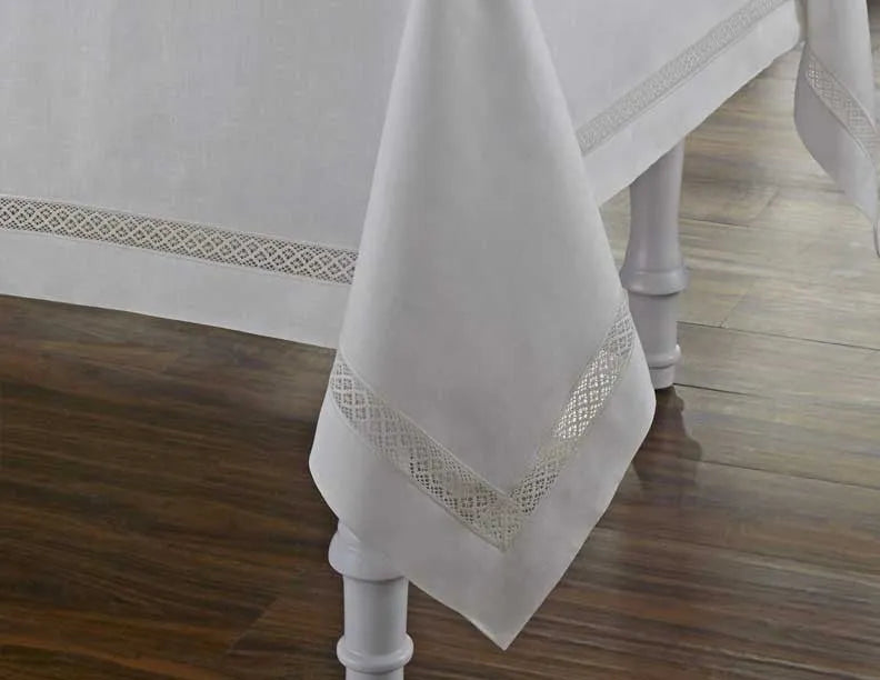 Les sets de table en lin Valencia sont ornés d'un empiècement en dentelle géométrique à l'ourlet. (Remarque : les sets de table sont vendus par lot de 6)