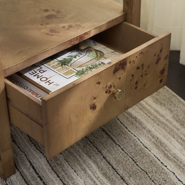 Sublimez votre espace avec la table d'appoint en bois Willshine, un mariage saisissant de beauté naturelle et de design soigné. D'une teinte naturelle chaleureuse, cette pièce est fabriquée en placage de loupe de bois, réputé pour sa texture riche et son élégance intemporelle. Dotée d'un tiroir unique, elle offre un rangement minimaliste et une fonctionnalité discrète, idéale pour un salon, une chambre ou un coin lecture. Avec ses lignes épurées et son savoir-faire artisanal, la table Willshine est à la fois pratique et un élément de design.