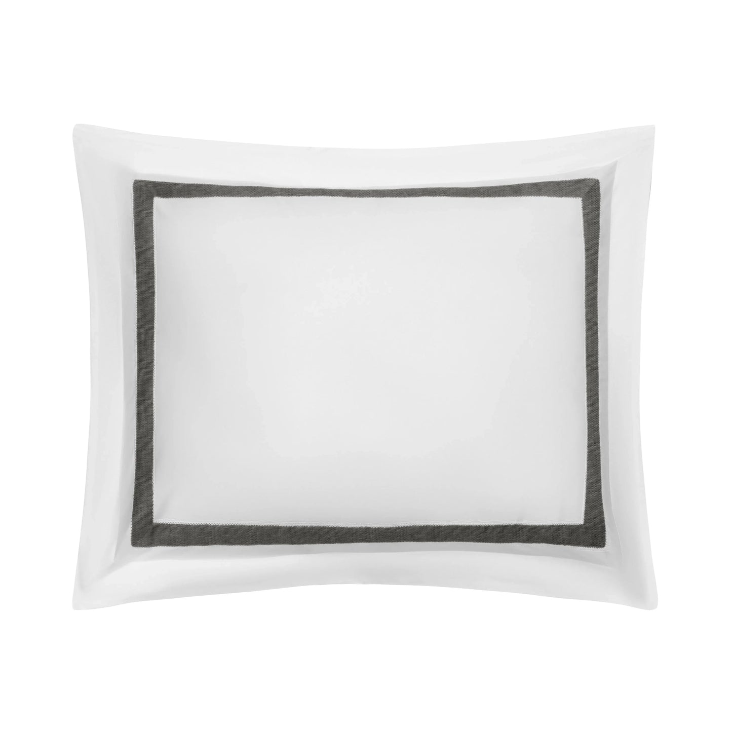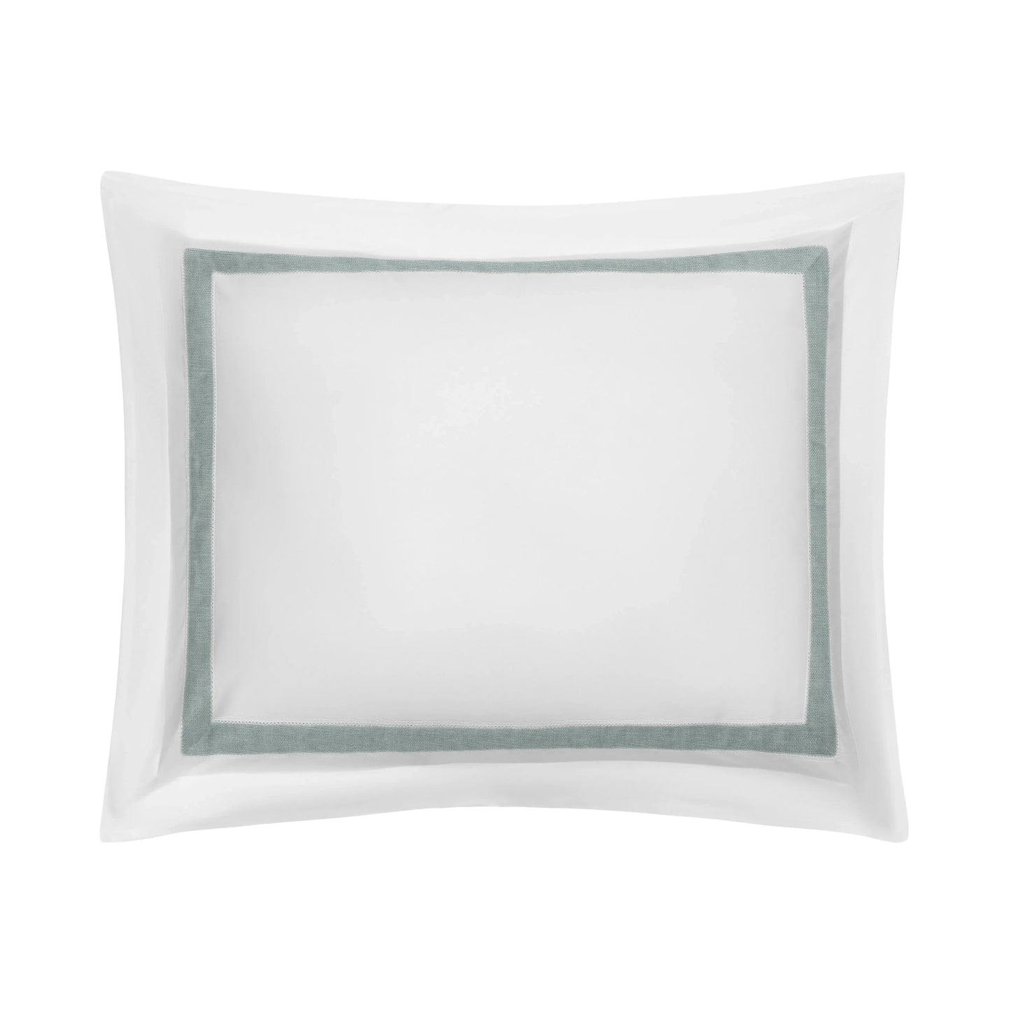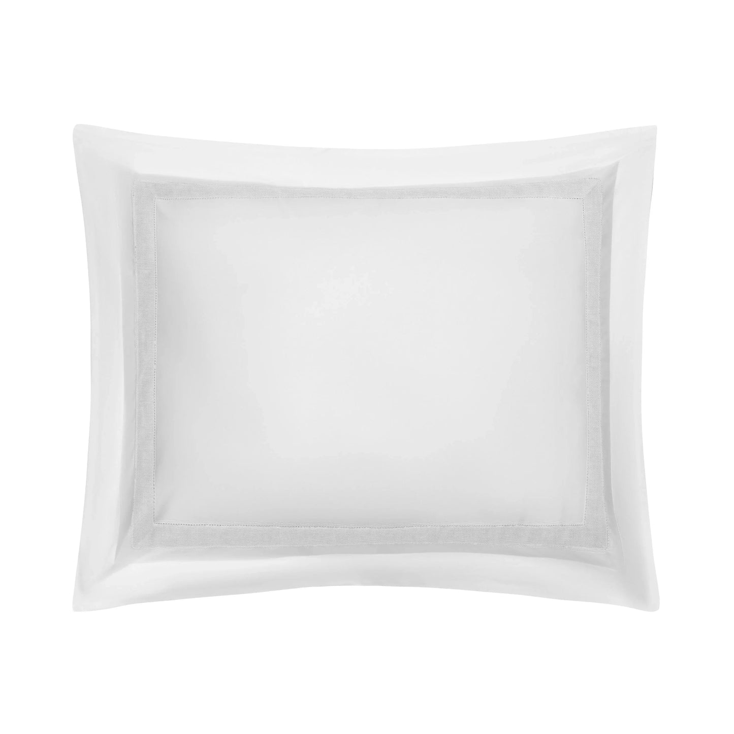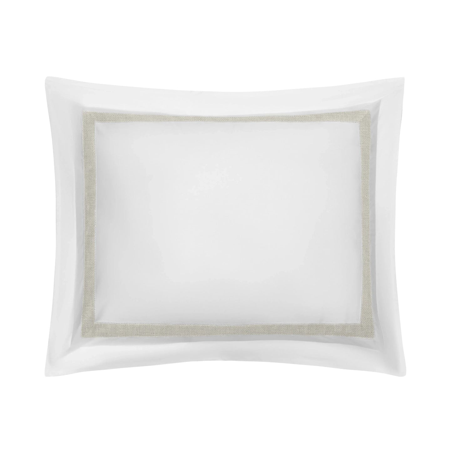 Les taies d'oreiller Yves sont conçues avec un corps en percale blanche Darcy de 600 fils et un insert en lin appliqué de 1', bordé de surpiqûres, sur le corps de la taie d'oreiller.